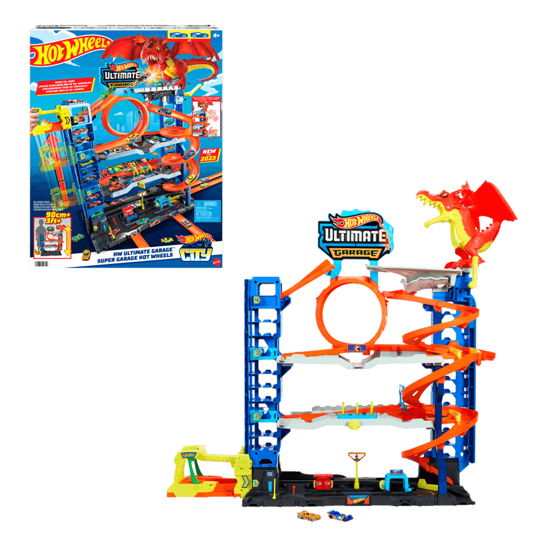Explora los cuatro niveles de carreras, acrobacias e historias con City Ultimate Garage de Hot Wheels. Cada nivel inspira aventuras de juego en pistas, incluidas carreras en paralelo, acrobacias de bucle y una batalla épica con un dragón que come vehículos. Los sets adicionales se venden por separado. Los colores y las decoraciones pueden variar.